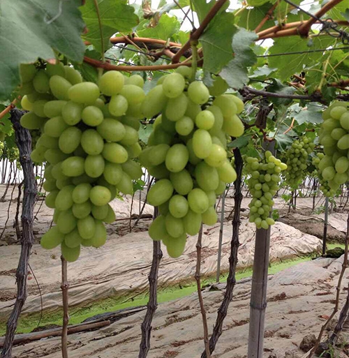 維多利亞葡萄長勢中庸,成花容易。為提高第二年的產(chǎn)量,增加種植效益,最好籬架栽培,并適當(dāng)加大種植密度。特別是加密株距。如果按行距2.5米,株距1.2--1.5米種植,畝栽176-220株左右。種植當(dāng)年每株留3-4根新稍,按第二年結(jié)果率90%計(jì)算,每株可結(jié)果8--12穗,產(chǎn)2公斤左右,這樣每畝可結(jié)果1500公斤。實(shí)現(xiàn)一年種植,二年豐產(chǎn)。